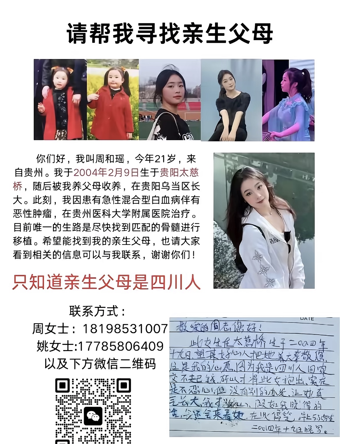 找到小瑶的亲生父母或兄弟姐妹进行配型,是眼下最佳的途径。然而,线索仅有当年亲生父母留在女儿襁褓中,一封泛黄手写的信。信文透露,小瑶2004年2月9日生于贵州太慈桥,写下这封信的亲生父母自称四川人,“回家交不起钱,所以才将此女抱出,实在是不忍心……”。