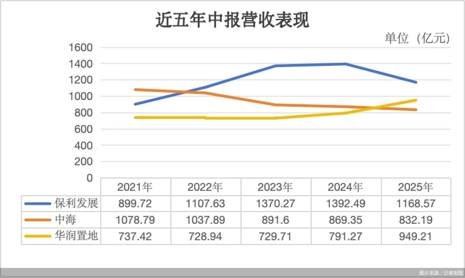 中报显示,2025年上半年,保利发展、中海及华润置地的房地产开发业务营收分别为1051.43亿元、779.62亿元及743.6亿元,占各企业总营收的比重分别达89.98%、93.68%及78.34%。