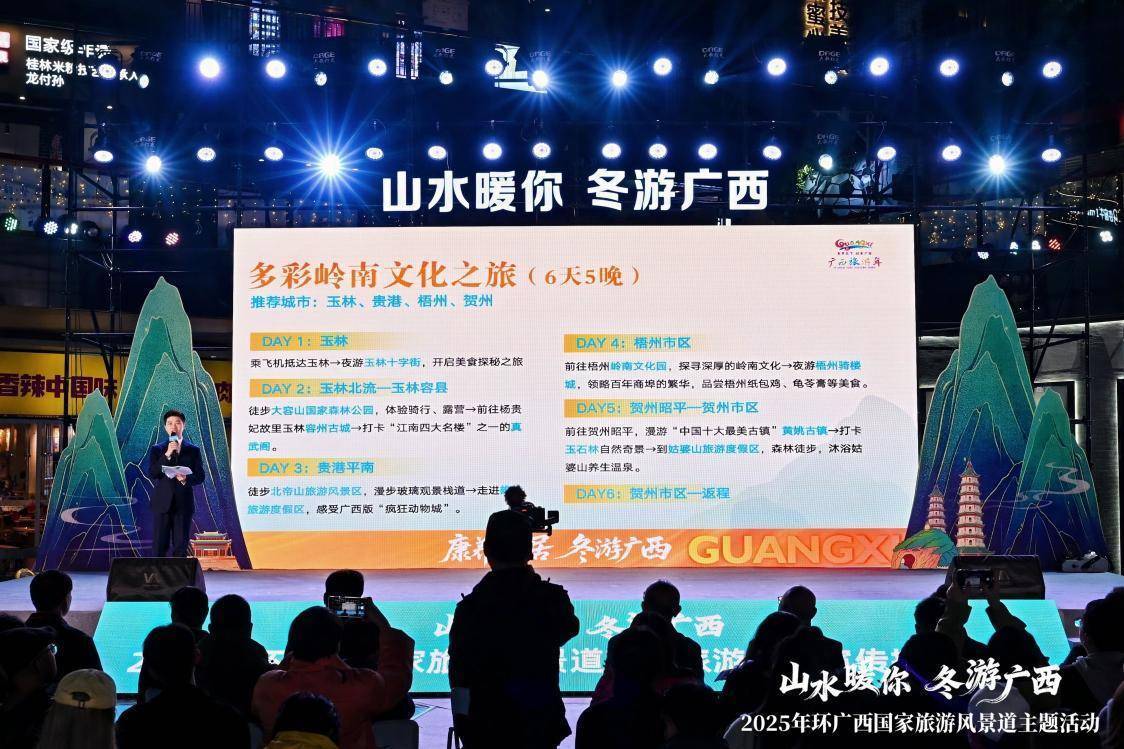 18日晚,作为系列活动之一的精品旅游线路宣传推介会在桂林阳朔益田西街举行。推介会上,主持人向观众介绍了“山水栖心·慢旅桂林”主题线路等一批精品旅游线路,其中涵盖壮美边关探秘之旅(南宁、崇左、百色)、非遗民俗体验之旅(桂林、柳州、来宾)、多彩岭南文化之旅(玉林、贵港、梧州、贺州)等,为游客提供了丰富的冬季出行选择。