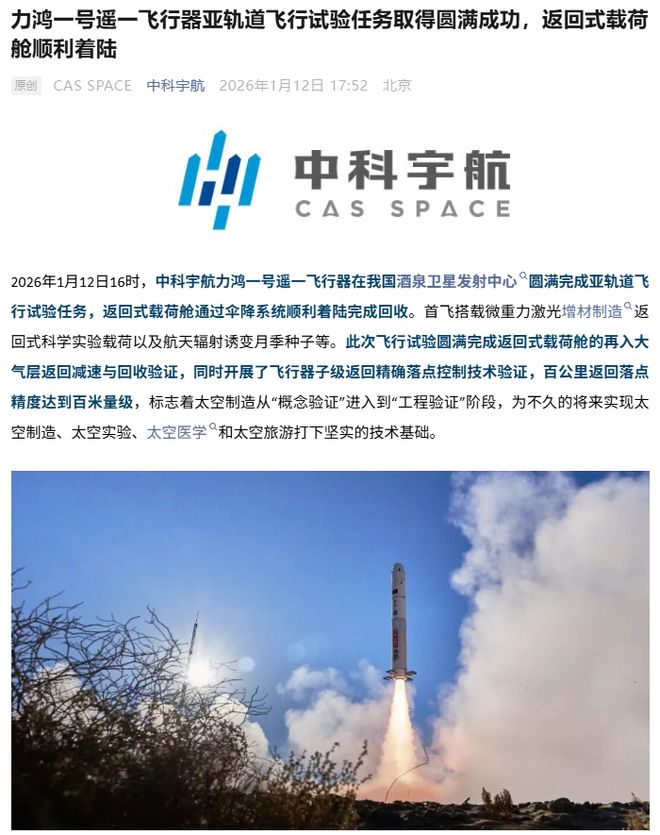 IT之家 1 月 12 日消息,今日 16 时,中科宇航力鸿一号遥一飞行器在我国酒泉卫星发射中心圆满完成亚轨道飞行试验任务,返回式载荷舱通过伞降系统顺利着陆完成回收。